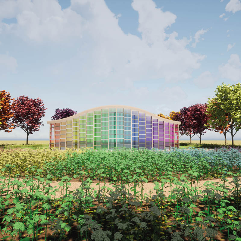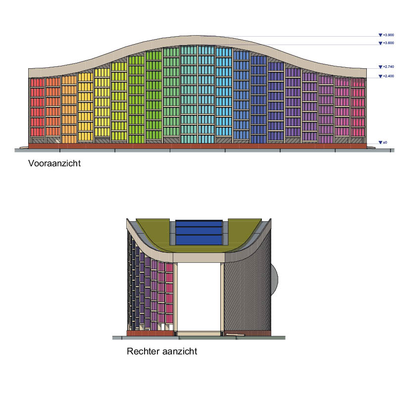 In opdracht voor de Almeerse WolUnie heb ik bij Arc² architecten mogen werken aan Shades of Nature, een circulair en remontabel paviljoen voor de Floriade Expo 2022 in Almere. Het paviljoen is gebouwd met lokaal geoogst en gezaagd hout. Beide gevels hebben een eigen karakter en laten een negatieve en positieve kant zien van de textielindustrie. De noordgevel geeft de verspillende kanten van de textielindustrie weer. Repen niet langer gebruikt textiel worden hier aan weer en wind bloot gesteld. De zuidgevel daarentegen geeft de natuurlijke kleuringsproces van wol weer. In glazen potten wordt lokaal wol op een langzame en natuurlijke manier gekleurd door plantenextract onder invloed van direct zonlicht. Hierdoor ontstaat zowel binnen als buiten een spectaculair kleurenspel. Langs de zuidkant van het paviljoen is een ondiep waterpartij aangelegd om nog meer zonlicht op deze gevel te krijgen. Ook zorgt dit water voor een prachtige spiegeling waardoor het paviljoen nog meer tot zijn recht komt.