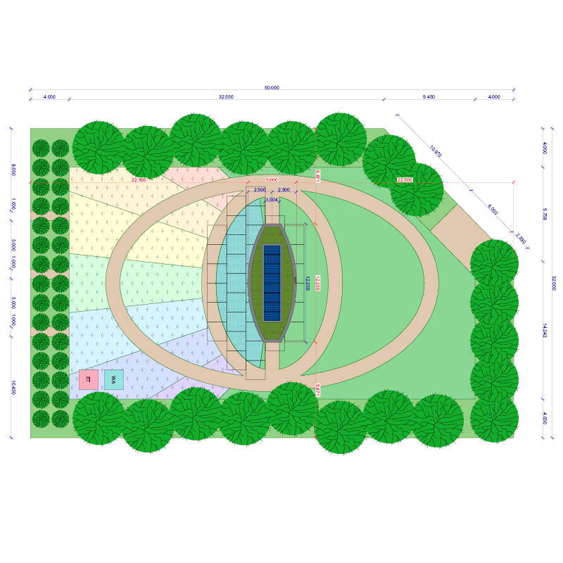 De bezoeker wordt eerst door de tuin geleid over een cirkelvormig pad om het paviljoen heen. In deze tuin wordt lokaal de benodigde planten verbouwd die nodig zijn voor het kleuringsproces van de wol. Vanaf dit pad is het paviljoen te betreden. In het paviljoen is het kleurenspel in de gevel nog beter te ervaren door de vele reflecties van de zon. Op de tegenoverstaande wand aan de entreezijden zijn met veren en lapjes leer twee kleur verlopen gemaakt van donker naar licht. Hierdoor wordt de bezoeker naar binnen getrokken. In het midden van deze wand is een zitmogelijkheid op een lange bank bedekt met lokaal wol.