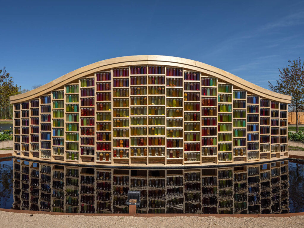 In opdracht voor de Almeerse WolUnie heb ik bij Arc² architecten mogen werken aan Shades of Nature, een circulair en remontabel paviljoen voor de Floriade Expo 2022 in Almere. Het paviljoen is gebouwd met lokaal geoogst en gezaagd hout. Beide gevels hebben een eigen karakter en laten een negatieve en positieve kant zien van de textielindustrie. De noordgevel geeft de verspillende kanten van de textielindustrie weer. Repen niet langer gebruikt textiel worden hier aan weer en wind bloot gesteld. De zuidgevel daarentegen geeft de natuurlijke kleuringsproces van wol weer. In glazen potten wordt lokaal wol op een langzame en natuurlijke manier gekleurd door plantenextract onder invloed van direct zonlicht. Hierdoor ontstaat zowel binnen als buiten een spectaculair kleurenspel. Langs de zuidkant van het paviljoen is een ondiep waterpartij aangelegd om nog meer zonlicht op deze gevel te krijgen. Ook zorgt dit water voor een prachtige spiegeling waardoor het paviljoen nog meer tot zijn recht komt.