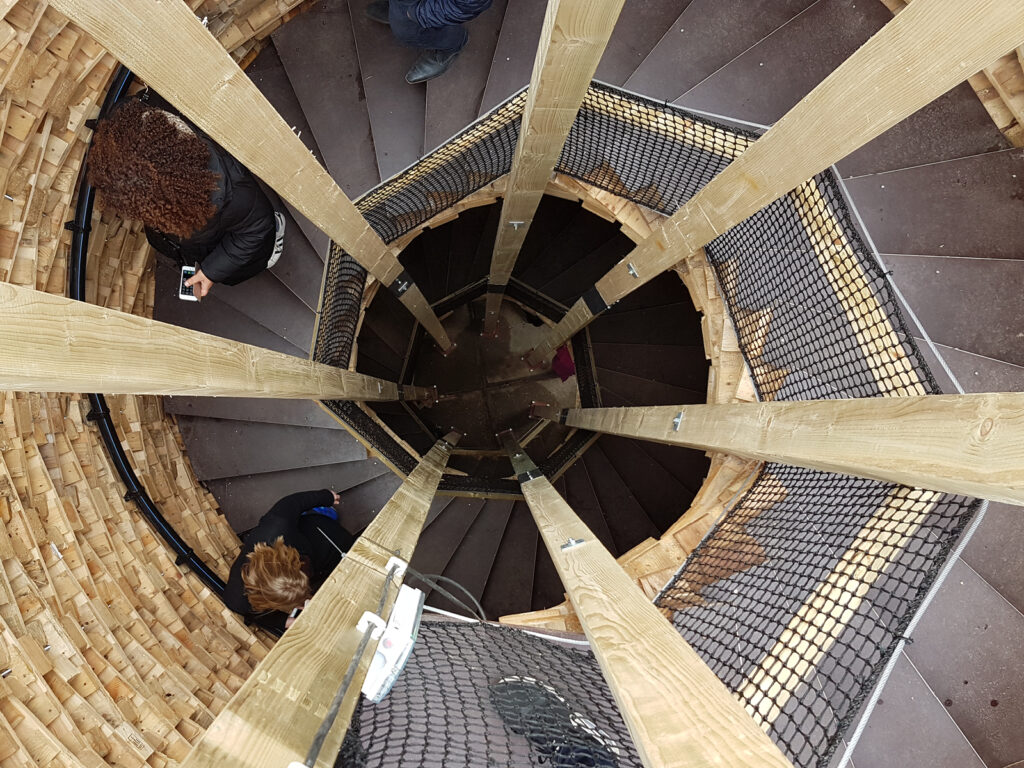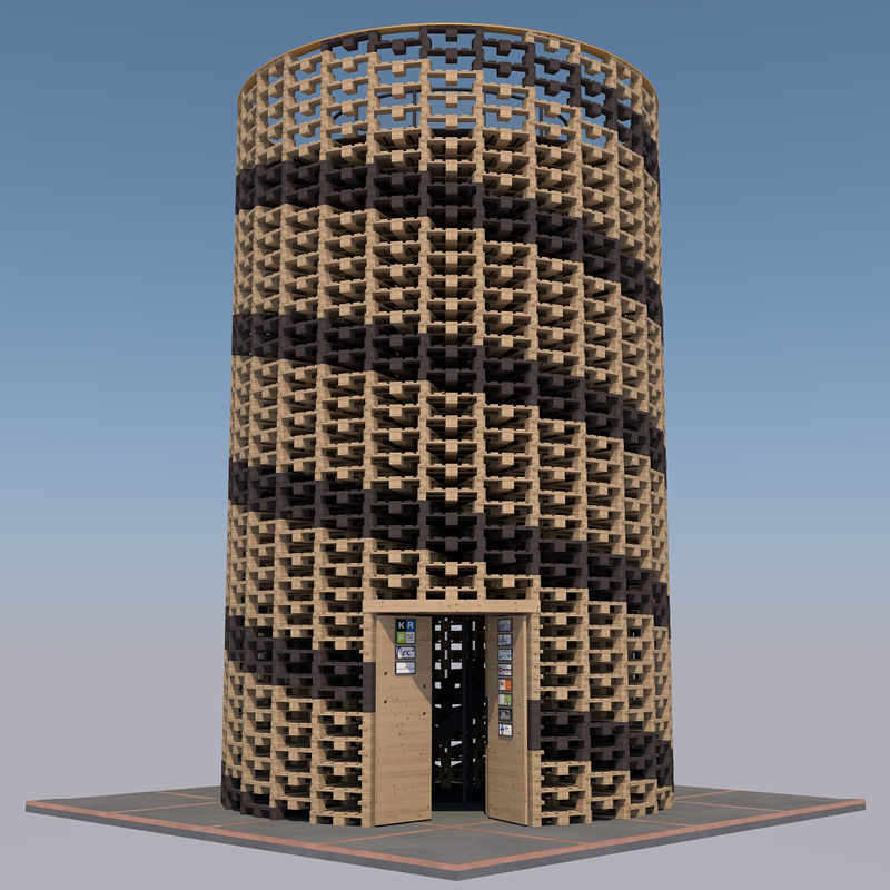 Houtwereld ‘SpiralTower circulair gebouwd met hergebruikte pallets‘