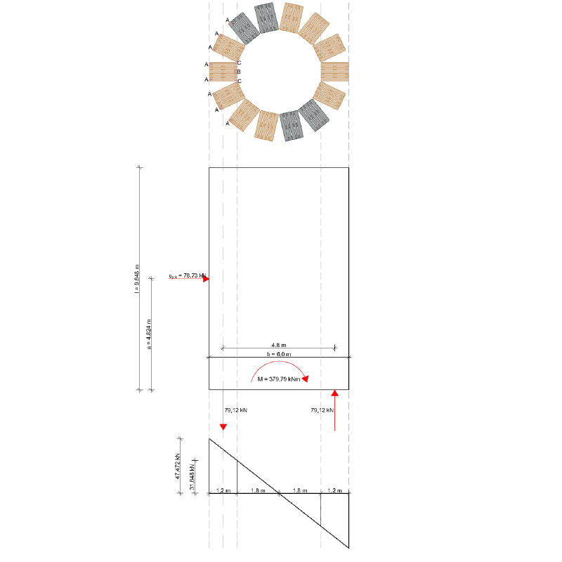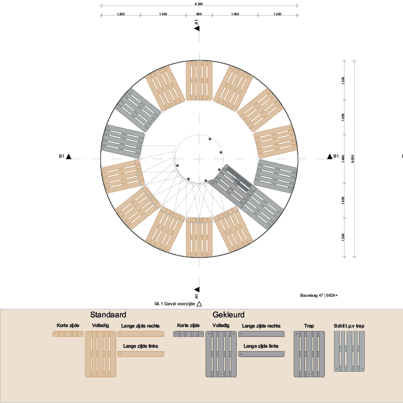 De Spiral Tower bestaat bijna volledig uit hergebruikte europallets. Deze pallets hebben een standaard afmeting waardoor ze modulair inzetbaar zijn. Sommige pallets zijn bewerkt om bijvoorbeeld als balustrade te kunnen toepassen. De pallets zijn op een tijdelijke fundering van hergebruikte stelconplaten opgestapeld. Om te voldoen aan constructieve eisen was het noodzakelijk om de pallets goed aan elkaar te verbinden. Dit hebben wij gedaan door de pallets in halfsteensverband te stapelen en in de klossen stalen staven toe te passen welke de pallets in verticale richting naar elkaar toe trekken. De spiraalvormige trap is ook gemaakt van pallets. Deze worden in de kern gedragen door houten kolommen. De treden zijn van buitenaf goed afleesbaar doordat deze pallets een contrasterende kleur hebben. Om het contrast ’s avonds ook afleesbaar te maken is er een lichtlijn aangebracht in de kleuren van KAF.